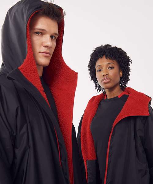 The ultimate team robe is made in a water-resistant fabric with a cosy sherpa fleece lining and three-piece hood. One size fits all, the roomy fit with double-ended full front zip allows wearers to keep warm and get changed underneath the robe. Perfect for wild swimming or wearing on team sidelines. Zipped pockets with fleece lining keep hands warm with multiple inner pockets for keeping belongings safe. Topped off with a large embroidery zip for access to directly decorate.